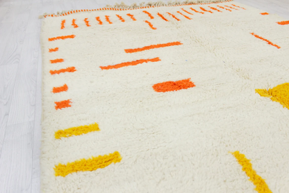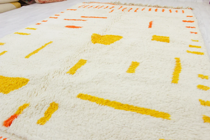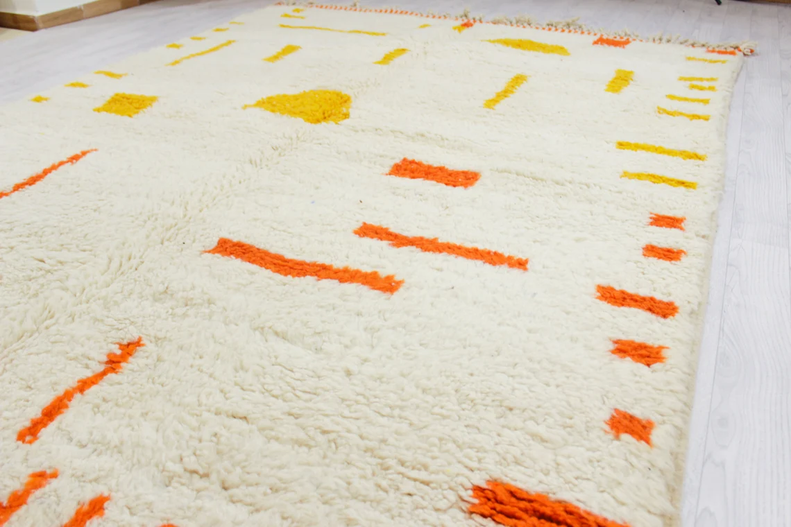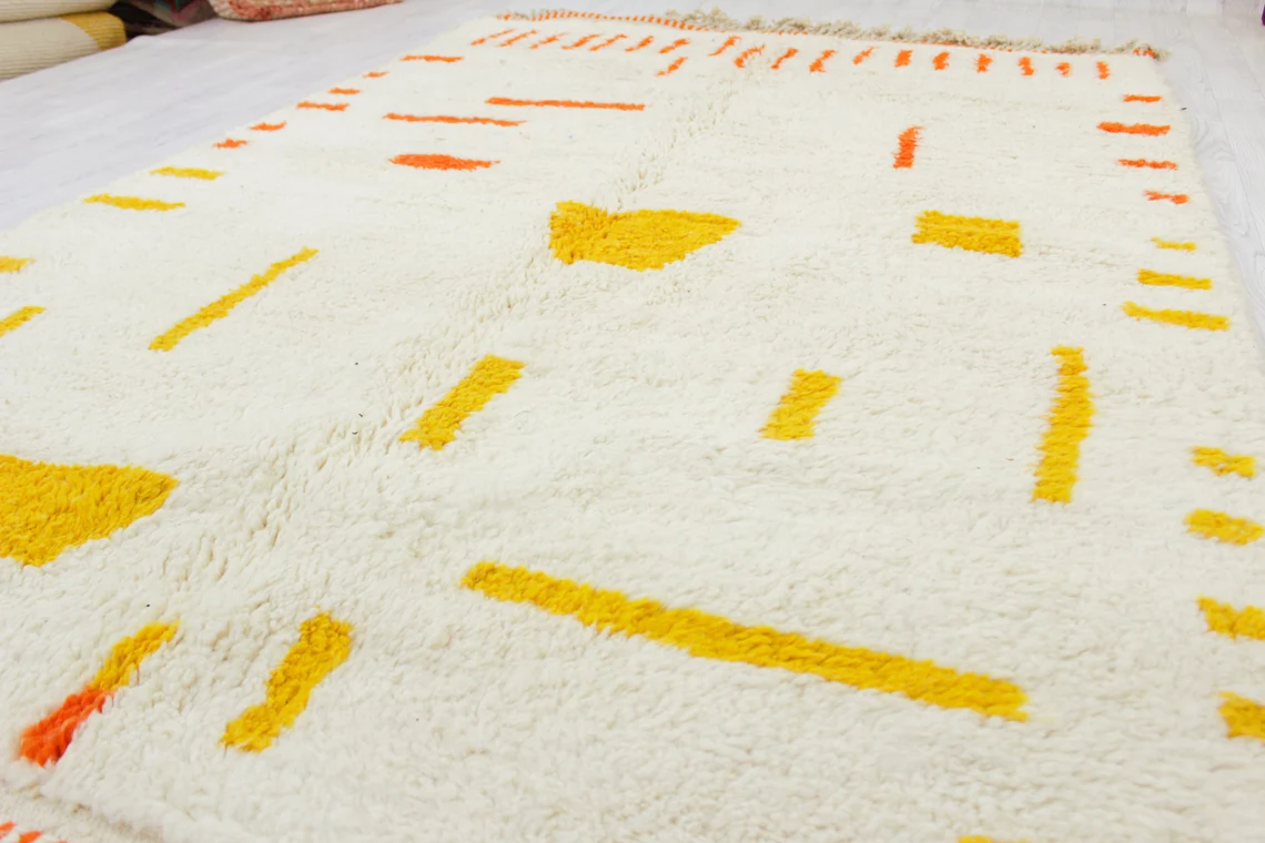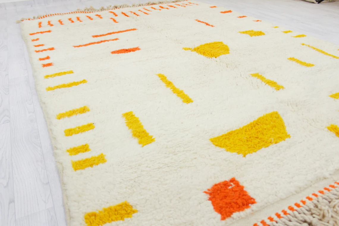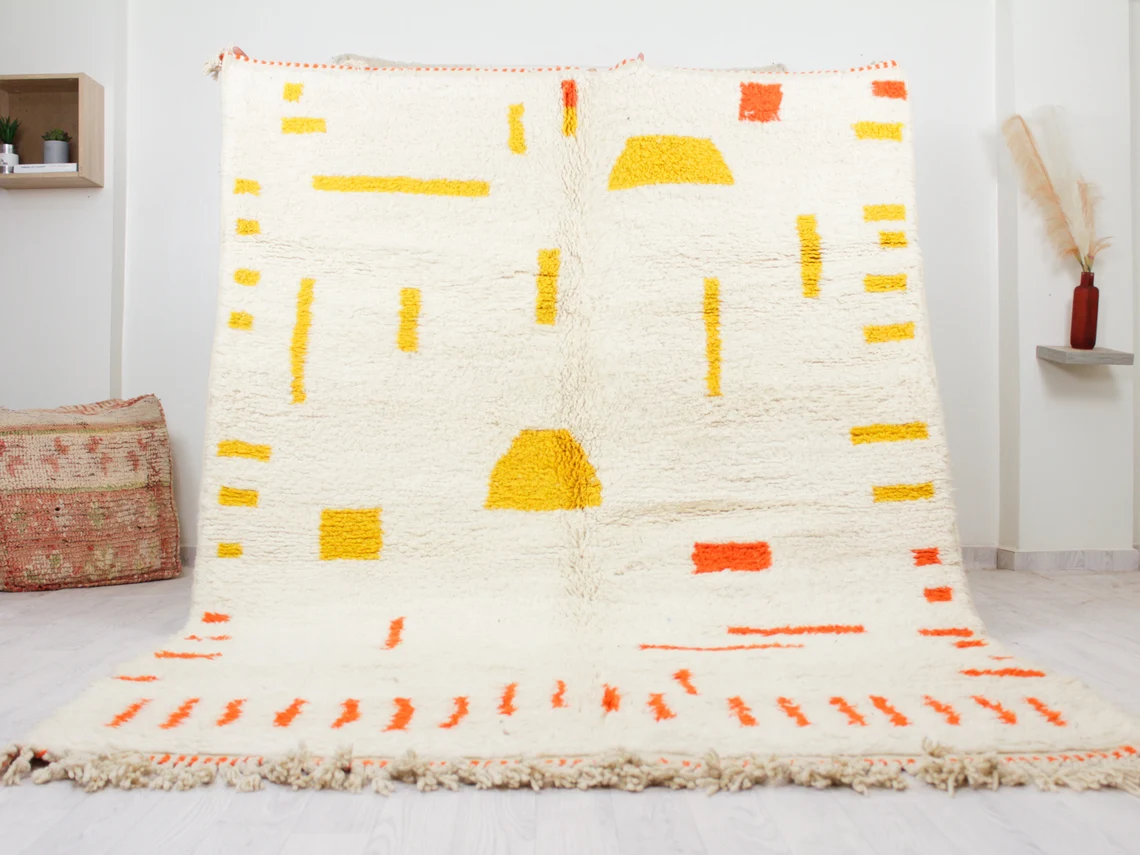 Le tapis Tafoughalt présente un fond crème ponctué de blocs jaunes et orange, offrant une interprétation contemporaine de l'artisanat marocain.